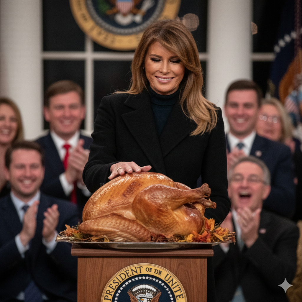 President Trump joked, “This turkey today is officially safe from Thanksgiving dinner—and probably Twitter too.” The audience laughed, and even the turkey seemed amused. The First Lady gently rested her hand near the turkey, and that photo—calm, graceful, almost symbolic—went viral in minutes.