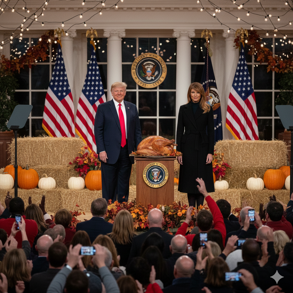 The White House South Lawn was decorated in warm autumn tones. Maple leaves swayed in the breeze as the turkey—freshly groomed, surprisingly calm—waited for its presidential moment of freedom. President Trump stepped to the podium, smiling more casually than usual. The First Lady stood nearby, elegant, relaxed, with a soft smile as cameras clicked.